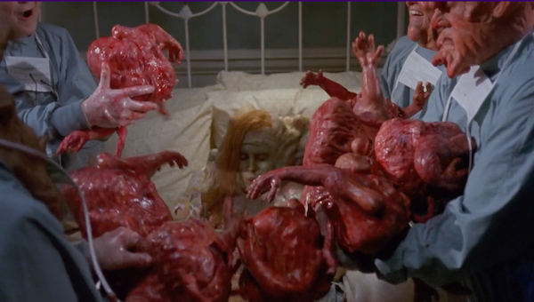 К счастью, сцена родов Евы меня всё-таки взяла. Когда у неё отходят воды, это выглядит так, будто прорвало пожарный гидрант. Потом вылезает малыш — точная мини-копия Белияла. Потом близнец. Потом ещё один. И они всё лезут и лезут, будто у неё вместо матки — та самая клоунская машинка из циркового номера. Тем временем папаша сидит запертый в своей корзине и мечтает, что лежит на круглой кровати с двумя голыми человеческими красотками, которые гладят его, целуют ему пальцы и декламируют любовные сонеты. Это, конечно, ответвление от основного сюжета, но, по-моему, вот ради такой дичи и имеет смысл вообще снимать BASKET CASE 3.