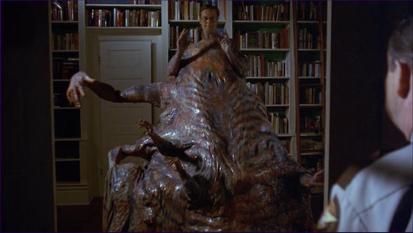 В итоге копы оказываются с малышами на руках, и самое неожиданное тут то, что им прямо нравится иметь под рукой эту «корзину отвратительных» – они находят их милыми. Но, разумеется, появляется Белиял, и снова все отлично проводят время, кроме копов, у которых то голову выворачивает, то вообще отрывает, или им так сжимают череп, что глаза выстреливают наружу, как в FRIDAY THE 13TH 3D. Интересно, хоть кто-то вспоминал об этой сцене, когда делали MALIGNANT? В своей рецензии на MALIGNANT я, кстати, упоминал BASKET CASE – Габриэль определённо творческий потомок Белияла, но я забыл, что в третьей части тоже есть безумная мясорубка в полицейском участке.