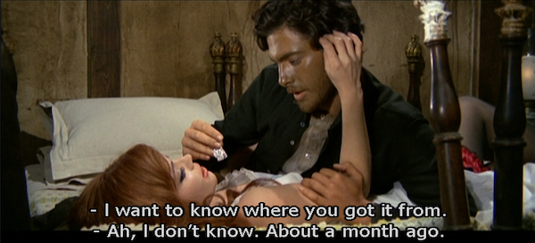 Хораз отдаёт Джонни небольшой резной предмет, который, по его словам, нашли рядом с телом отца. Фильм грозит стать совсем скучным в тот момент, когда Джонни начинает идти по цепочке улик о том, кто убил его отца и украл 30 000 долларов золотом — возможно потому, что мы с самого начала знаем ответ, да и он сам ведёт себя так, будто тоже его знает. Зато мне нравится эпизод, когда артисты останавливаются в той же гостинице: мы снова видим, как парень-мим кувыркается, а Джонни проводит ночь с красивой рыжеволосой актрисой (Стефания Каредду, ANY GUN CAN PLAY). Он делает вид, будто это произошло лишь потому, что её серьги совпадают с предметом, найденным у тела, но да ладно — он мог бы спросить об этом заранее. Он прекрасно знал, что делает.