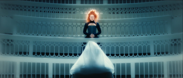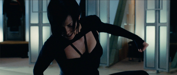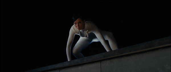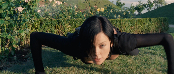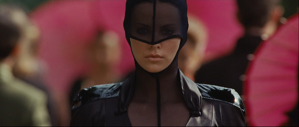 Как и её мультипликационный прототип, она — акробатка и гимнастка-конторсионистка. Она карабкается, спускается по веревке, делает сальто, перекатывается, прыгает, скользит, кувыркается, ползает, как насекомое. (Режиссёр второй съёмочной группы/координатор трюков: Чарльз Кроугвелл [RAVEN].) В отличие от мультфильма, она носит штаны (и мне не хватает её больших наколенников), но костюмы Беатрикс Аруны Пастор (« Даже ковбойши блюз» , «Разворот» , «Психо» , «Обманчивая кость» ) всё ещё подчёркивают характерные формы и движения Терон. Фильм, безусловно, наиболее удачен в своих ранних, менее объясненных сценах, например, когда она целует прохожего на улице, и ее язык проникает ему в рот, словно рука, вытаскивает капсулу, которую мы видим на рентгеновском снимке, когда она опускается ей в горло и попадает в желудок, а затем отправляет свое сознание в камеру (на самом деле это исторический театр вскрытия животных в берлинском приюте, построенный в 1790 году), где она получает инструкции от своего дрессировщика (Фрэнсис Макдорманд, «Темный человек» ).