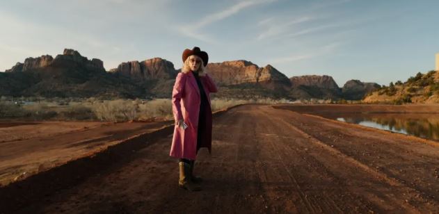 Начальный кадр: Женщина в длинном розовом пальто и ковбойской шляпе идет по дороге, затем муж просит ее повернуться к камере.